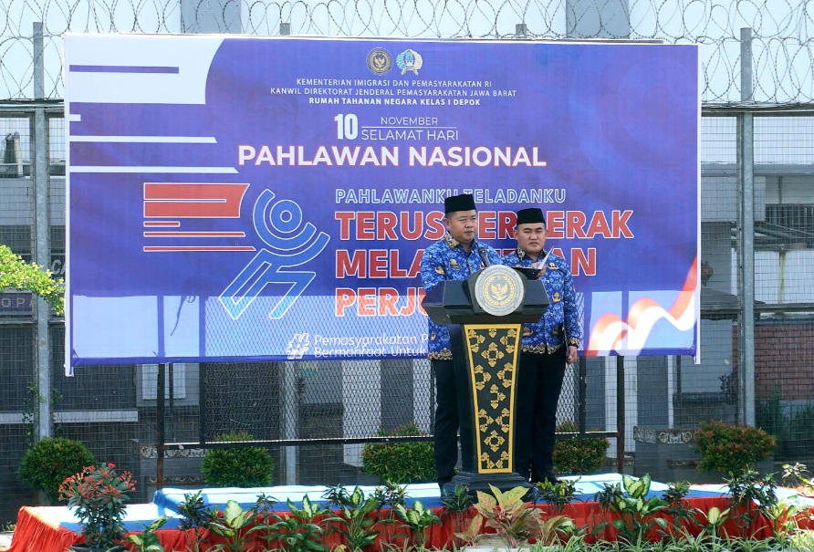 Kepala Rutan Kelas I Depok Agus Imam Taufik yang memimpin langsung upacara bendera, mengajak seluruh peserta untuk meneladani semangat juang para pahlawan yang telah mengorbankan jiwa dan raga demi kemerdekaan bangsa.