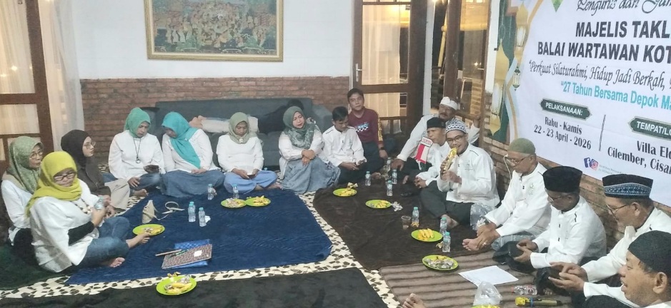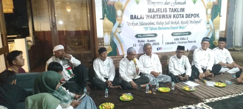 DEBAR.COM.-BOGOR, JABAR- Dengan mengangkat tema ‘Perkuat Silaturahmi, Hidup Jadi Berkah, Rezeki Melimpah’ serta semangat ’27 Tahun Bersama Depok Maju’, Majelis Taklim Balai Wartawan Kota Depok menggelar kegiatan Halalbihalal yang diikuti oleh pengurus dan jamaah di Villa Eldia 2 kawasan Cilember, Cisarua, Puncak, Bogor pada Rabu – Kamis (22-23/04/2026).